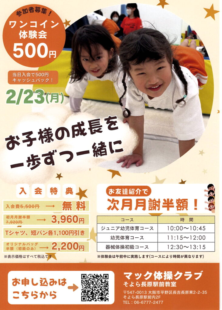2月23日(月)の午前中に参加費500円の体験会を行います!!